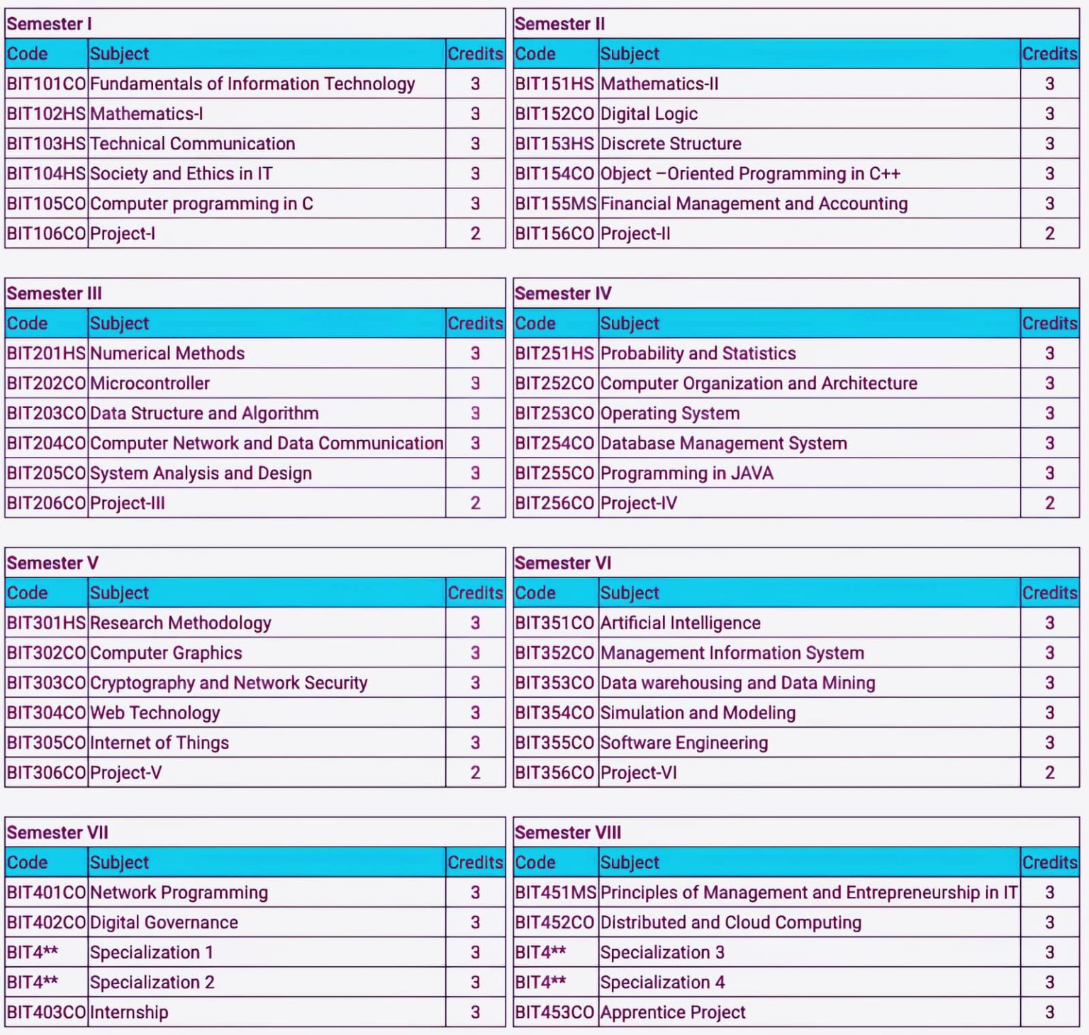 The BIT program at BPC spans over a period of four years, divided into eight semesters.