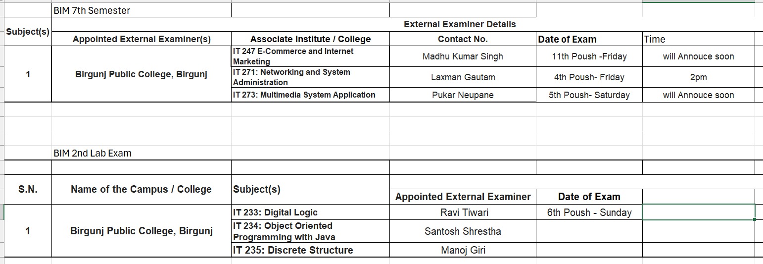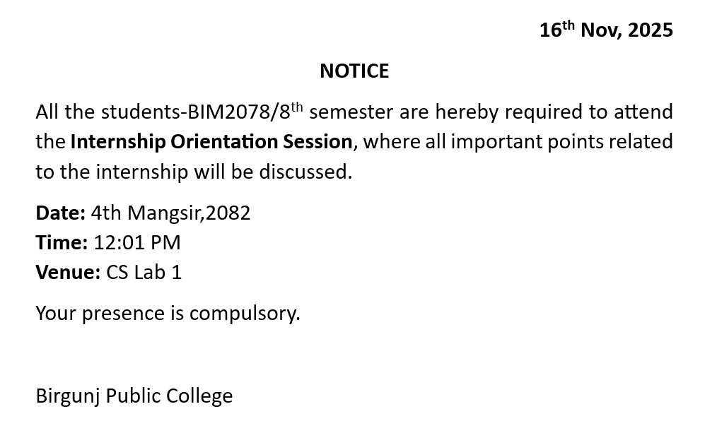 | 3 | BIM 3rd and BIM 8th 81/78 | Ref no/Letter no: 2082/36 9th Nov, 2025 Notice This is to inform all BIM 3rd Semester (Batch 2081) and BIM 8th Semester (Batch 2078) students that regular classes will commence from 4th Mangsir 2082. The class timetable will be published soon. All students are hereby required to attend the classes mandatorily. Please note that the Learning Management System (LMS) has been fully implemented in the college. All class-related updates, materials, and notices will be available through the LMS โ Administration, Birgunj Public College | No file | admin | 2025-11-09 19:24:55 |